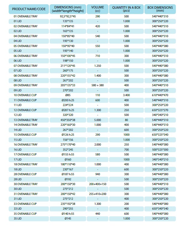 Fırınlanabilir/mikrodalgada kullanılabilir kağıt gıda kaplarının özellikleri aşağıda listelenmiştir; * Gıda uygulamaları için FDA onaylıdır. * Yüksek ısı uygulamalarına dayanabilir ve hem fırında hem de mikrodalga fırında erimeden, deforme olmadan pişirilebilir. * Dondurucudan fırına pişirme özelliği. * Kullanım sınırlamaları -40°C ila 260°C. * Müşteri baskılı üretim mevcuttur. * Her boy için kağıt kapak mevcuttur.